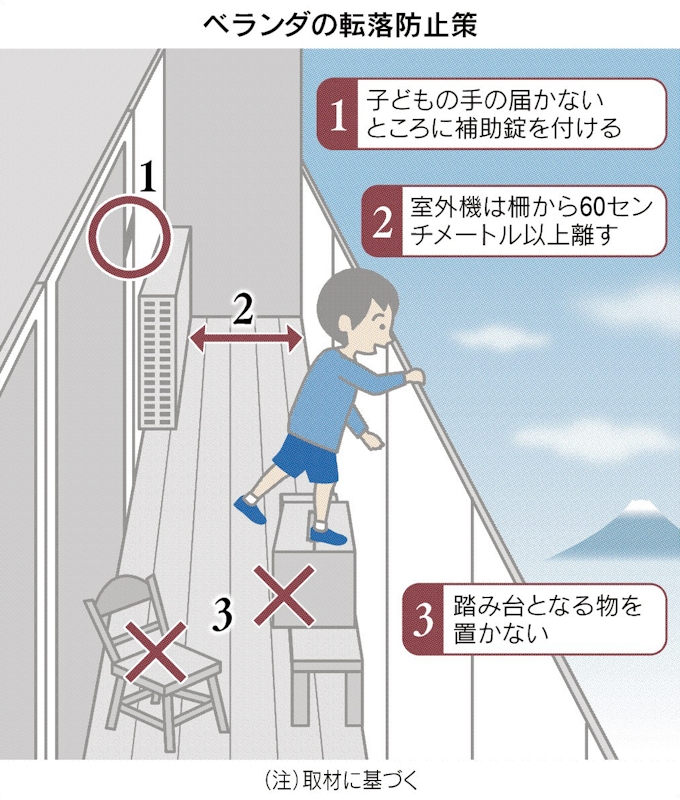 消費者庁は転落防止対策として、(1)ベランダの手すり付近に足場になるものを置かない(2)エアコンの室外機などを手すりから60センチ以上離す(3)手すりなどに劣化がないか定期的に点検する(4)子どもだけを家に残して外出しない――などを呼びかけている。